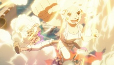 - Plötzlich ist sind wieder Trommeln der Freiheit zu hören sowie Ruffys Stimme die sagt dass er wieder volle Energie hat. Er ist wieder in seinem Gear 5 Nika-Form woraufhin das Meer selbst anfängt gummiartig zu werden und alle Schiffe anfangen auf und ab zu hüpfen. Ruffy ruft sie solle sich alle zum Rhythmus der Trommeln bewegen woraufhin die Riesen anfangen den Nika-Tanz machen den Bonney von ihrem Vater gelernt hat. Die Riesen verstehen nicht was los ist da sie eigentlich das Feuer löschen wollten doch müssen sie alle nun plötzlich lachen und tanzen als wäre es ein Fest. Ruffy zeigt sich Bonney und fragt ob sie nicht ihm Weisen einen richtigen Schlag verpassen will so wie er es vorhin ihr gezeigt hat. Bonney meint jedoch dass sie unmöglich sei da sie nicht so sei wie Ruffy doch Ruffy meint dass sie Unsinn sei. Er würde ihre Fähigkeit nicht ganz verstehen und doch könne sie sicherlich dass auch hinkriegen. Bonney erinnert sich wie Ruffy ihr einst sagte dass er sich in dieser Form fühlt das wäre er freier als nie zuvor. Sie erinnert sich an die Beschreibungen ihres Vaters und nutzt dann ihre Teufelskräfte um sich in eine Zukunftsvariante zu verwandeln wo sie ebenfalls ein Nika ist. Alle sind über das Auftauchen eines zweiten Nikas erstaunt. Auch der antike Roboter im Meer scheint sie zwei Nikas zu spüren und schaltet sich wieder ein. Derweil bläht sich Ruffy auf so gut es geht und greift sich Mars. Er erklärt dass schlagen, schneiden und quetschen bei diesen Typen nicht funktioniert weshalb nur eins übrig bleibt sie wegzufegen. Ruffy presst Mars in seinen Bauch und erklärt dass Sanji, Franky und Bonney Ruffy von der an anderen Seite aus Angreifen sollen. Bonney ist schockiert über diesen Plan und wie bereit Sanji und Franky sind diesen auszuführen. Sie kann jedoch schnell überredet werden den Plan zu befolgen und greift zusammen mit Sanji und Franky Ruffys Rücken an. Die Wucht der Attacke die Ruffys gewaltigen Gummibauch trifft, trifft somit Mars den Ruffy dann rechtzeitig los lässt woraufhin dieser Meilen weit weggeschleudert wird bis man nicht mehr sieht. Die Riesen haben inzwischen das Feuer gelöscht. Ruffy fragt Sanji wo Nami &. Co. bleiben. Sanji wundert sich darüber auch schon. Atlas hat ein schlechtes Gefühl bei der Sache und will nachschauen gehen woraufhin sie zur Wolkeninsel fliegt.