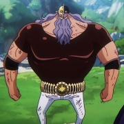 Dieser besiegte die gesamte Bande mit einer Attacke und ging weiter.[16] Kurz darauf erschien jedoch Shiryuu und gab jedem Bandenmitglied ein Gegengift, wodurch sie überlebten. Kurz darauf trat er der Bande bei.[17] Auftauchen in Marine FordNachdem Ace von Admiral Akainu getötet worden war, Whitebeard diesen im Zorn angriff und das Marinehauptquartier beschädigte, entdeckte man die Blackbeard-Piraten, die sich schon eine Weile die Kämpfe mit ansahen. Die Bande war inzwischen durch ehemalige Insassen von Level 6 des Impel Downs gewachsen. Dank Raffit, der die Marinesoldaten, die für das Tor der Gerechtigkeit zuständig waren, hypnotisierte, gelangte die Bande bis nach Marine Ford. Später griff Jesus Barges mit seiner Bande Whitebeard an und tötete ihn.[5] Anschließend warf die Blackbeard-Bande ein schwarzes Tuch über Whitebeard. Blackbeard begab sich darunter und eignete sich Whitebeards Teufelskraft an. Dies war der Zeitpunkt, wo Senghok endlich eingriff. Der Großadmiral verwandelte sich durch seine Teufelskraft in einen Daibutsu und attackierte die Bande mit einer starken Schockwelle.[18] Aufstieg zur Kaiser-BandeEinige Zeit nach den Ereignissen in Marine Ford hielt die Blackbeard-Bande Jewelry Bonney auf einer unbekannten Insel in der Neuen Welt gefangen, flüchteten aber, als Akainu auftauchte.[19] Ein Jahr nach der Schlacht von Marine Ford und Whitebeards Tod forderte die verbliebene Whitebeard-Bande unter der Führung von Marco die Blackbeard-Piratenbande zum Vergeltungskrieg heraus. Die Whitebeard-Bande musste allerdings eine vernichtende Niederlage einstecken und nach dieser Schlacht wurde Blackbeard endgültig zum Nachfolger Whitebeards als einer der Vier Kaiser anerkannt.[20] Blackbeard nutzte das Wissen um Whitebeards ehemaliges Territorium und machte es sich mit seiner Piratenbande schließlich zu eigen. Sie wurden außerdem berüchtigt dafür Jagd auf starke Teufelsfrüchte zu machen, um ihre Fähigkeiten zu erlangen.[21] Irgendwann zu dieser Zeit traf die Blackbeard-Bande auf einer Insel in der Neuen Welt zudem auf den einstigen Admiral Kuzan und es kam zu einem kleinen Kampf zwischen Kuzan und Blackbeards Untergebenen, infolgedessen Kuzan sie einfror. Als Blackbeard erschien, machte Kuzan dies wieder rückgängig und sie verstanden sich überraschend gut. Sie tranken gemeinsam und sprachen über den Kampf der Admiräle, aber auch über die Road-Porneglyphe. Letzten Endes schloss sich Kuzan der Bande an.[22] Dress Rosa – Die FeuerfruchtAls Don Quichotte de Flamingo ein Turnier im Kolosseum von Dress Rosa veranstaltete, bei dem der Gewinner die Feuerfrucht von Ace gewinnen konnte, nahm auch Jesus daran teil. In der ersten Runde kämpften die Teilnehmer in Blöcken unterteilt als Battle Royal, wobei nur ein Gladiator gewinnen konnte. Im Kampf des A-Blocks nahm Jesus teil, der maskiert unter dem Pseudonym "Mr. Store" kämpfte. Nachdem er die Runde gewonnen hatte, nahm er die Papiertüte ab und enthüllte seine wahre Identität.[23] Als Ruffy gegen Don Chinjao kämpfte, gesellte er sich zu Cavendish und Bartolomeo, die dem Zweikampf von den Zuschauerrängen der Gladiatoren zusahen. Als der Kapitän der Strohhut-Piraten schließlich gegen den Ex-Piraten siegte, bekam er durch die beiden Rookies mit, dass es sich bei dem vermeintlichen Lucy um Ruffy handelte. Dies wiederum fand der Kapitän des ersten Schiffs der Blackbeard-Bande sehr erfreulich, worüber er auch begeistert lachte.[24] Er sprach sogleich mit seinem Kapitän über eine Teleschnecke, wobei Barges anmerkte, dass er Kuzan nicht vertraue. Da Ruffy aber seinen Weg kreuzte, beendete er das Thema und sagte seinem Kapitän, dass der Strohhut nun mithört. Teach war sich sicher, sein Mann werde die Feuerfrucht gewinnen. Auf Ruffys Ansage, dies nicht zuzulassen, lachten sowohl Barges als auch sein Kapitän.[25] Später betrat er den Ring erneut, zusammen mit Bartolomeo, Rebecca, Diamante und dem falschen Lucy, um am Battle Royal teilzunehmen.[26] Als er kurz darauf von einem kämpfenden Fisch attackiert wurde, nutzte er seine Kräfte, um diesen mit einem Schlag zu besiegen und gleichzeitig auf das Publikum zu schleudern. Gleich darauf lieferte er sich mit Lucy einen Schlagabtausch, wobei beide mit Haki verstärkten Schlägen aufeinanderprallten. Lucy gelang es dabei, Barges' Armschiene zu zerbrechen.[9] Im Verlauf des Kampfes versuchte Barges immer wieder Lucy zu attackieren, welcher die Angriffe geschickt abwehrte und dazu nutzte, die Arena zu beschädigen.[27] Als es Lysop und Robin gelang Sugar auszuknocken, war Barges äußerst schockiert, als Lucy den gesamten Ring mit nur einem Angriff kollabieren ließ.[28] Nachdem Lucy die Feuerfrucht gegessen hatte, bemerkte Barges, dass es sich dabei nicht um Strohhut Ruffy handeln konnte und war darüber frustriert, dass er die Frucht an ihn verloren hatte.[29] Jesus Barges tauchte erst während Ruffys Endkampf gegen De Flamingo wieder auf. Nachdem Ruffy Gear 4 nicht mehr aufrechterhalten konnte und sein Haki erst regenerieren musste, sprang Barges vom Königspalast aus auf die zweite Ebene herunter. Er plante sich Ruffys Gum-Gum-Frucht unter den Nagel zu reißen. Schnell tauchte er vor Gats und dem verletzten Ruffy auf, konnte jedoch nicht Hand an sie anlegen, da Sabo Barges' Angriff rechtzeitig abwehrte.[30] Als Sabo erklärte, dass er sich um Barges kümmern wollte, erkannte dieser, dass es sich bei Lucy im Kolosseum um Sabo gehandelt hatte, da er im Besitz der Feuerfrucht war. Daraufhin hatte es Barges auf Sabo abgesehen und die beiden begannen ihren Kampf.[31] Barges war Sabo allerdings deutlich unterlegen, sodass er versuchte Sabo zu provozieren. Mit einem Dolch plante er ihn in einem unachtsamen Moment zu attackieren. Sabo katapultierte ihn anschließend mit einer Feuerfaust in die nächste Häuserreihe und verletzte ihn schwer.[32]